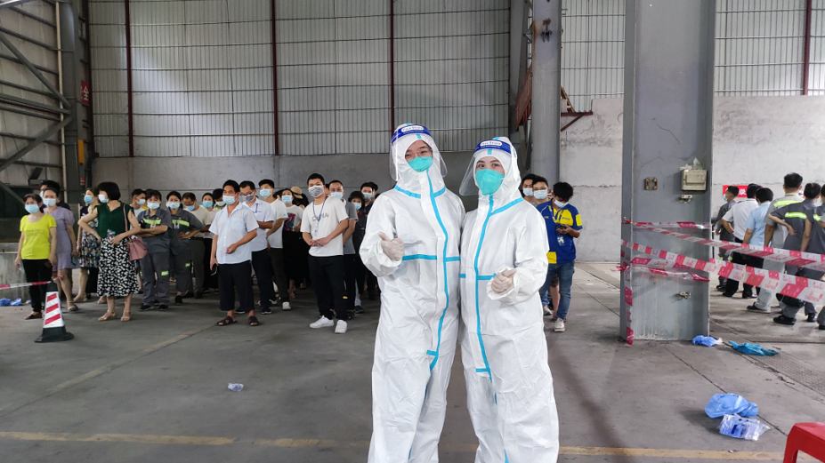 時(shí)間就是生命,疫情就是命令。6月7日晚,政府通知,廣州澳華達所在的黃埔區86萬(wàn)人需要在一天內完成全員核酸檢測任務(wù)。由于時(shí)間緊、任務(wù)重、人手少,當天夜里政府工作人員在群里發(fā)出急需志愿者支援的號召,公司的伙伴們“疫”不容“遲”,緊急行動(dòng),積極響應政府號召,迅速組建了“鏗鏘四人行志愿者小隊”,于次日早上8點(diǎn)準時(shí)到達抗疫陣地。他們身著(zhù)防護服,全副武裝,沖鋒在前,不計個(gè)人得失,不懼高溫酷暑,任汗水無(wú)數次的濕透衣衫,仍盡職盡責,有序做好各項志愿服務(wù)工作,為疫情防控盡一份自己的力量,為這場(chǎng)沒(méi)有硝煙的戰疫筑起安全壁壘。