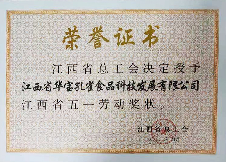 4月29日,鷹潭市總工會(huì )召開(kāi)慶祝2022年“五一”國際勞動(dòng)節暨五一勞動(dòng)獎和工人先鋒號表彰大會(huì ),華寶股份旗下江西省華寶孔雀食品科技發(fā)展有限公司榮獲“江西省五一勞動(dòng)獎狀”。