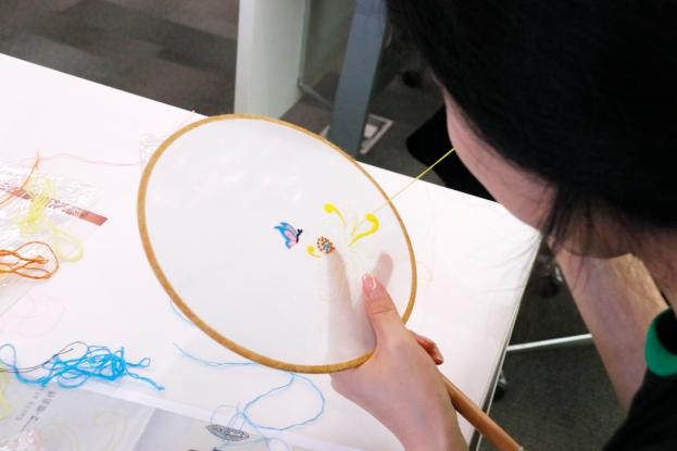 在聽(tīng)完老師的講解后,大家紛紛穿針引線(xiàn),刺繡過(guò)程中,大家互相交流,并經(jīng)過(guò)老師的指導和示范,繡出精致的圖案,用手中的針線(xiàn)傳遞了指尖的藝術(shù)與浪漫。